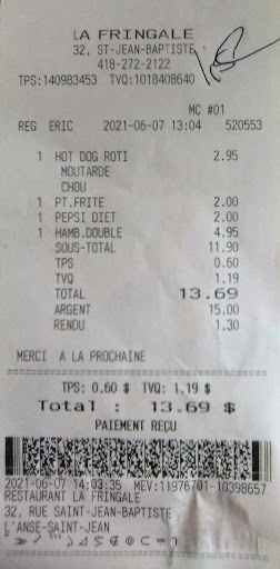 Nous y avons pris notre repas du midi le7 juin 2021. Nous avons pu manger à l’intérieur et ce fut un réel bienfait en zone confortable pour ne pas colorier quoi que ce soit. Mon épouse a commandé un hot-dog rôti moutarde chou à $2.95 avec une petite frite à $2.00 et une cannette de pepsi diète à $2.00 tandis que ce fut un hamburger double à $4.95 pour moi pour un total de $13.69 avec taxes. L’ambiance était agréable et tout était propre. Il y avait quelques tables de pique-nique avec parasols à l’extérieur et il y avait aussi possibilité de manger sur la terrasse extérieure. La canicule et le fait que nous étions en moto nous a fait opté pour se sustenter à l’intérieur à l’air conditionné. Nous avons 6 photos à vous proposer dont celle du reçu détaillé. Nous recommandons ce restaurant de style casse-croûte de bon goût.