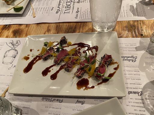 The restaurant has a great atmosphere, and the bar area is awesome, with a lot of glass shelves and casings and a ton of Veuve Cliquot bottles displayed at the end. Staff does their best to greet and serve with a smile and have helpful suggestions and explanations about the menu. Though the food was satisfying, it wasn't stellar, the double burger a bit dry, and the Lotus beef tartar a bit heavy on the pomegranate and lacking in the other spices. The red wine glass overpriced at 11$ and underserved. The 9$ choice was no longer available. That's pretty much my biggest concern with this place. Overpriced. 90$ for two: three mini burgers, two 2 ounce tartars and a drink each (one cocktail and one glass of wine). All in all, an ok...