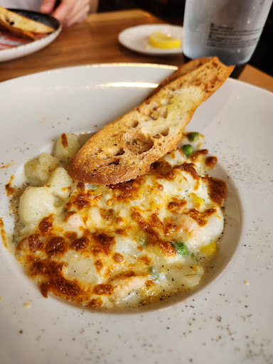 We had a nice corner table looking out across the quaint street running in front of Chez Julien Bistro. A beautiful towering church sat in all its glory across the street and held my attention for quite some time. Our waitress greeted us well and we had our first glimpse at the wine list and menu. Chardonnay is my liking so I ordered a glass of Canadian Chardonnay which was fine. It was not particularly chilled and the amount was far from generous as the large, empty, wine glass at the table was first removed and then replaced with my much smaller one, but I said nothing. A first choice of mine is always fish. The waitress needed to explain the dish to me because it is apparently different each evening. Unfortunately, the white fish had an escargot white sauce over the top of it, a taste for which I do not care. At a price of $29.00, gnocchi with a simple lettuce salad was my order; indeed, a tasty meal but hardly worth the cost. We split a piece of chocolate caramel cheesecake and I ordered coffee with cream but was told there was no cream. I was utterly amazed! A French restaurant with no cream! Appalling!
