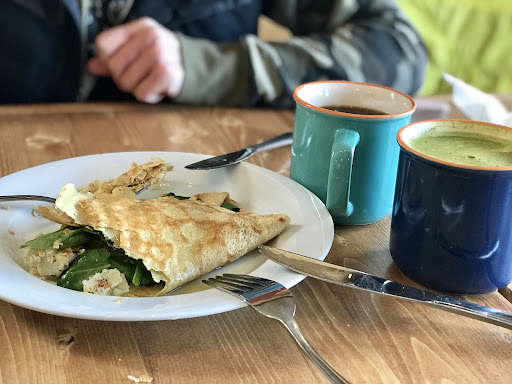 Read morePerfect cafe for a casual meetup with friends! Excellent coffee and tasty crepes both sweet and savory, served in a small but interestingly finished new-industrial space. Mostly manual wheelchair accessible, though power chair users may find this space tight. The front door has a small lip that may make getting the door open a task, though the owner was quick to jump up and grab the door for us. We were there on a rainy sunday which made this cafe a bright and cosy place to be even though the windows were fogged up, but I can imagine this would be a really nice spot in the spring and summer with greenery outside the side door and (I think) a roll-up door. You can tell the owner takes pride in her coffee, too, which we need more of in this part...