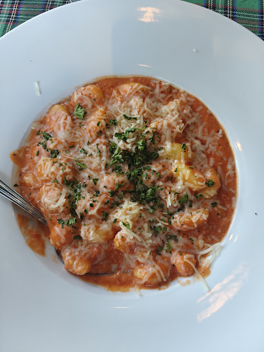 We arrived at 7:06 and we were promptly seated by the host. There were about 30 people seated in total, including the patio. There were many empty tables. It wasn't until 7:17, 11 minutes after we arrived, that our server finally came along to take our drink order. Having been down this road before, my wife and I knew to order our drinks, appetizers and entrees all at once, or we would be there for hours longer than we wanted to be. Our bottled water arrived 13 minutes after we ordered it. Two small bottles from the cooler to our table took 13 minutes, or 24 minutes from when we arrived to get our drinks. It wasn't until 7:53 (36 minutes after we ordered) that our bruscetta arrived. Bread, tapenade, a slide of tomato and cheese, baked for two to three minutes took 36 minutes to arrive. At this point I asked for my small Caesar salad that I had still not received. That took another 11 minutes. Sixty-seven (67!!!) minutes after we ordered, our entrees arrived. My food was as expected, but my wife's gnocchi was overcooked.