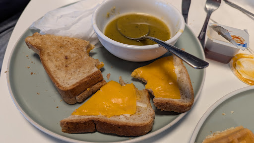 This place is a joke. The coffee is terrible. Watery and weak. I sent it back which is something I've never done or even considered before. The grilled cheese special for $14.99 was two pieces of bread with two cheddar cheese slices and a tiny bit of shredded white cheese. The split pea and ham soup was watery, with no ham. See photo. The chicken & waffles breakfast - the chicken pattie was a flat piece of breaded overcooked chicken. The waffle was good but came with no butter. I had to get up and ask for syrup after trying, and failing, to catch our servers attention. For the senior's breakfast, the poached egg was served in a ramikan and did not slide out but it was cooked to medium as ordered. The two servers behind the counter were either talking to each other or checking their phones. Then one of them put an empty box on top of the other one's head. Yes, this really happened. Neither came to clear our dishes away once we were finished.