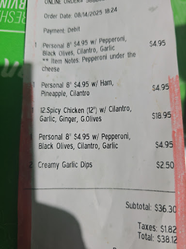 When I called to ask if they have halal chicken, the lady over the phone said âyes, the donair chicken is halalâ. So we placed an order for a large pizza with the donair chicken. When I arrived 15 minutes later, they said to wait another 10 minutes since they just placed the pizza in the oven. I then asked for the halal certification, to which she said they donât have the certification but to trust her word that it was halal. I told her that any location that serves any sort of halal chicken has to have the certification. I canât take anybodyâs word as that automatically loses the storeâs credibility. She then called the owner to which they said that although they have halal donair chicken, they donât have the certification in the store.