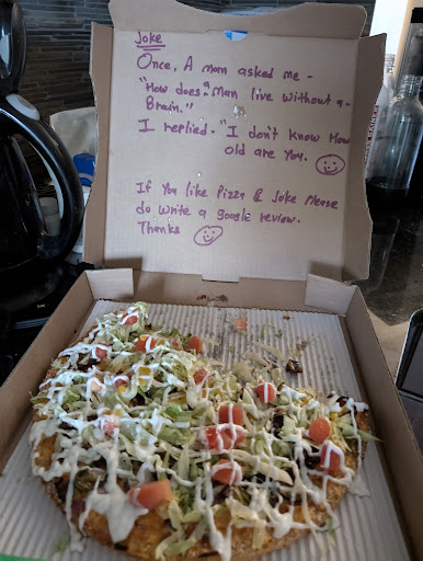 They even wrote a fun joke on the inside of the pizza box after I ordered today, which is super nice of them and got a good laugh out of me and my bf đ I'll share a picture of the pizza I got with the fun joke on the box here, I got a beef taco, and also ordered an all meat pizza for my partner.