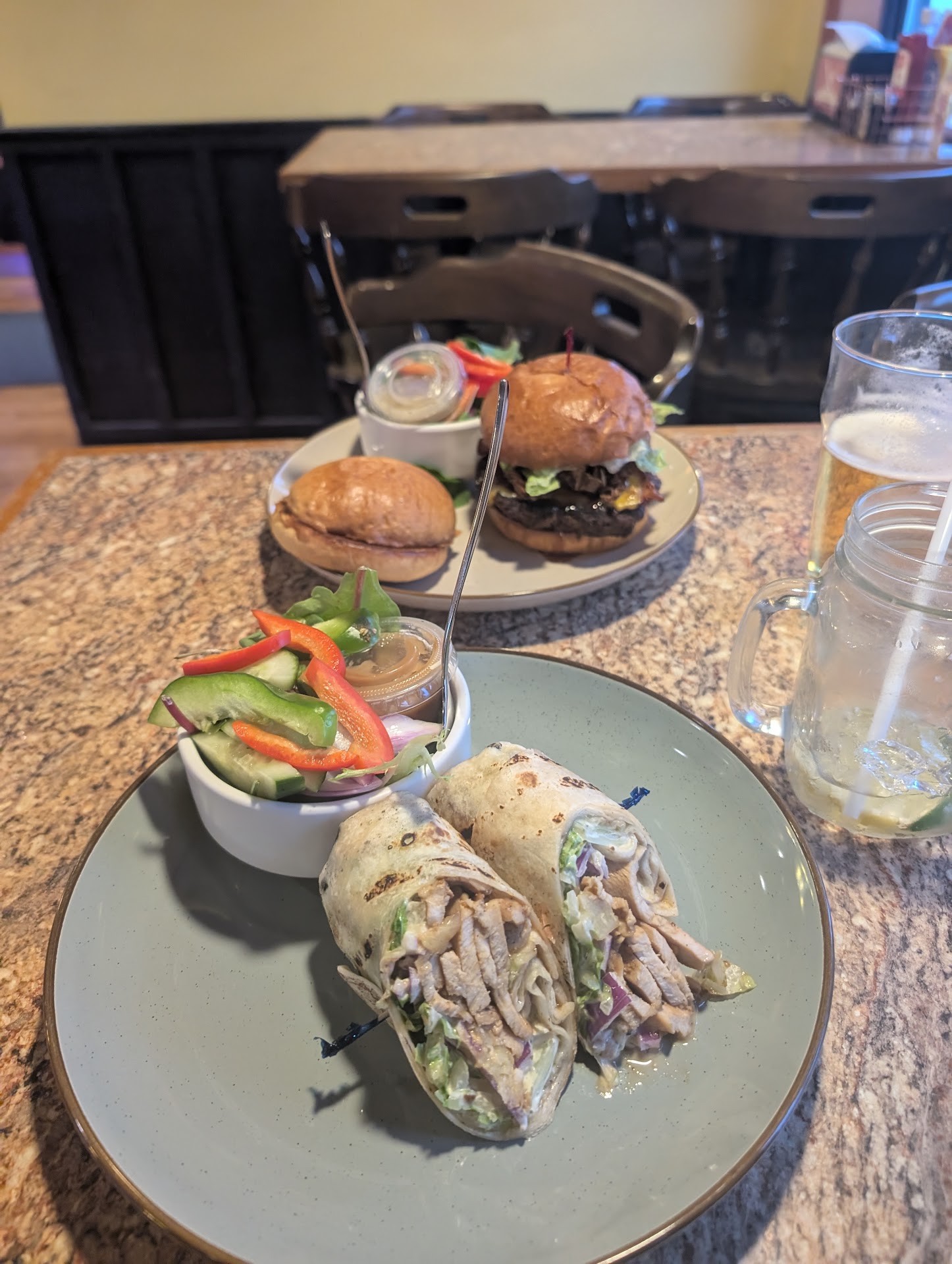 Food: not everyone got what they wanted one burger ordered was black and SO dry - the other was good apparently. informed that choice or potato meant fries or broiled. No mashed or baked on a Saturday night even though it was a listed potato option mixed vegetables were raw and barely warm (also had asked the server while ordering what the veggie of the day was and she just told me she didn't know and that she hadn't served any today yet?) chicken fajita was made with microwavable chicken bits - cold and rubbery - couldn't even eat half of the fajita -I will give it to them that their bread and fries are amazing!