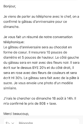 J’ai demandé un gâteau en forme de cœur moitié noir, moitié rose, pour mon anniversaire. Je voulais des fleurs noires sur le côté gauche du cœur et des fleurs de couleurs sur le côté droit du cœur. Quand j’ai reçu le gâteau je n’avais pas de mots tellement qu’ils avaient fait l’opposé de ce que j’avais demandé. Ils ont mis des fleurs blanches sur le côté gauche quand j’avais clairement précisé que je voulais des fleurs noires. En plus j’ai questionné le pâtissier sur les fleurs qu’il pensait mettre sur le côté droit, il m’a dit par téléphone qu’il allait au marché le lendemain les chercher et qu’il irait voir. Finalement quand je reçu le gâteau, il n’y avait aucune fleur du marché. Il a fait les fleurs avec le même pastillage du gâteau. Sans parler des lettres sur le gâteau on aurait dit un enfant de 5 ans qui les avait faites. Ça ne ressemblait pas aux lettres que j’avais demandé comme dans la photo. En plus, les invités n’ont pas trop aimé le goût du gâteau.