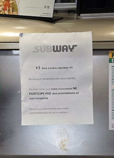 La caisse enregistreuse avait un bogue lorsqu'est venu le temps pour moi de payer. AprĂšs avoir attendu 10 min devant la caisse, on me dit finalement que mon sous-marin allait ĂȘtre gratuit, car la caisse ne fonctionnait plus du tout. Je dĂ©cide de manger sur place. Pendant que je suis en train de manger, la caissiĂšre revient me voir pour me dire que le bogue Ă©tait rĂ©glĂ© et que j'allais devoir payer. J'ai Ă©tĂ© obligĂ© de payer! DĂ©solĂ©, mais ça ne se fait juste pas. On ne fait pas payer le client aprĂšs lui avoir dit que c'Ă©tait gratuit et aprĂšs l'avoir fait attendre pendant 10 minutes Ă la caisse. Je conseille Ă tous les clients d'aller Ă un autre Subway. On ne respecte pas les clients Ă ...