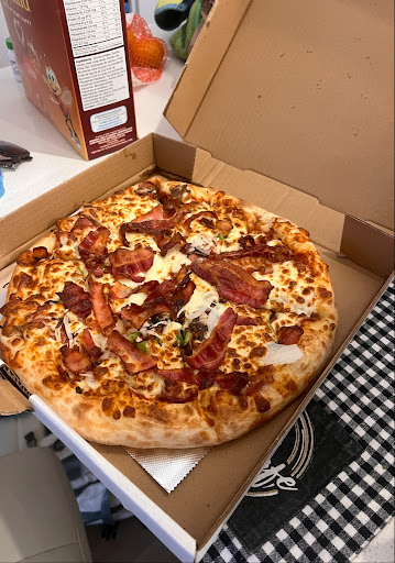 Nous avons pris la moyenne (12 ")pizza spéciale Cabtree qui était comme une all-dressed ,mais qui contenait du bacon ,ainsi que des oignons et c’était vraiment délicieux . La pâte de pizza est croustillante et mince,le fromage est de qualité,la sauce est bonne ,ils ont mis des bonnes tranches de bacon au lieu de petits morceaux ,donc je dirais que c’est assez généreux en ingrédients. À deux nous avons eu trois tranches de pizza chaque pour une 12". La moyenne frite est grosse pour deux nous aurions dû prendre la petite,car la moyenne convient pour 4 je dirais ! Elles étaient bonnes quoique qu’elles manquaient un peu de cuisson à mon goût ,car elles étaient môles. (Non,ce n’était pas dû au fait que c’était une commande pour emporter ,nous en avons mangé dans l’auto hihi c’était leur sorte de frites.)Sinon, le restaurant est propre ,mais nous avons pris une commande pour emporter . Cela a pris seulement 10min pour recevoir notre commande et tout était frais ! La raison pour laquelle j’ai mis 4 étoiles est seulement dû aux prix ,car c’est quand même dispendieux comparé à certains restaurants de la même qualité . J’ai trouvé dommage aussi qu’ils ne font pas de combo avec toutes les sortes de pizzas, mais seulement avec les all-dressed. Bref, ça vaut quand même la peine d’essayer si vous aimez la pizza avec du bacon...