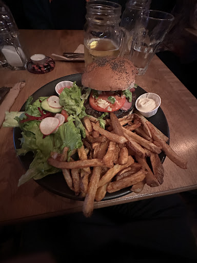 I had a halibut burger with an upgrade to a poutine and a side salad. The halibut burger was delicious! Unlike most places with fish burgers, the halibut tasted fresh. Almost as if it was caught the morning of. The poutine was amazing, with delicious local cheese and gravy that definitely did not come out of a box.