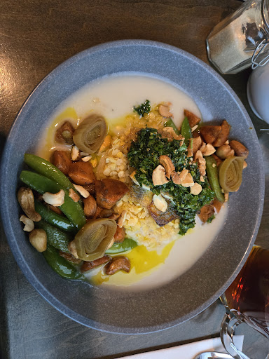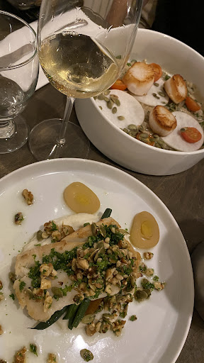 Fantastic, personalized service and delicious, locally sourced ingredients married in a cozy atmosphere… what more would one need? We had oysters and halibut ceviche as an entrée and risotto with scallops and the cod (they ran out of halibut) for the main dish. Desert: carrot cake. Wine? Just speak with the owner/sommelière who is super fun and knows her wines! We had a bottle of Sauvignon blanc (Un Saumon dans la Loire), which was her personal recommendation and an absolutely fantastic pairing with our meals. Did I mention the incredible sunset views from the deck?...