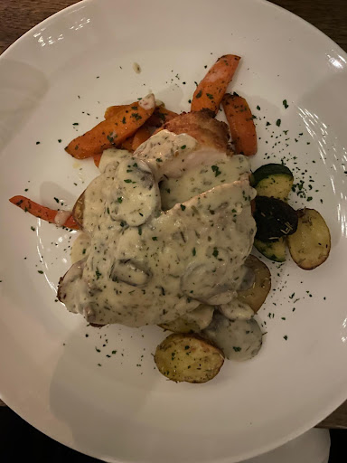 He had fish and chips, and I had chicken cordon bleu. His was very tasty, good tarter, good crisp to the batter. His only complaint was the fish was bordering on rubbery which, is easy to happen to battered fish. The flavor however, was good. The cordon bleu was excellent: the chicken was hot, tender, juicy, with a crisp crumb surrounding it. The truffle mushroom sauce had excellent savory flavor, and the veggies were perfectly al dente, and hot. My only complaint on my dish were the potatoes were bordering towards cold, so I feel they were likely plated prematurely. What saved them was the hot sauce poured over. But again, the flavor of the potatoes was still good.