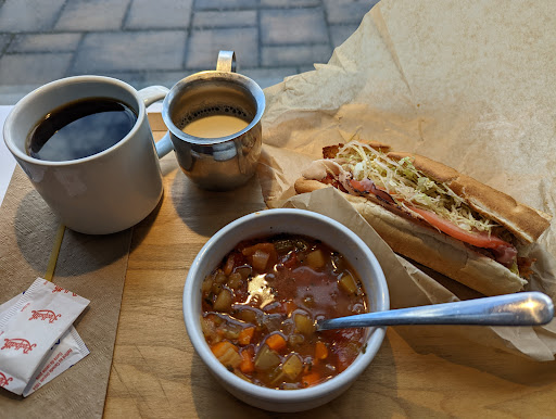 Had the club sandwich, spinach quiche and vegetable soup. It was all fine. The front of the store where you order is noisy and the staff were a bit confusing as they were talking over each other and seemed to think we should know the process of how to order. The back seating area was quiet and a couple of the tables had people clearly parked for a while. We were there Friday at noon and there was plenty of...