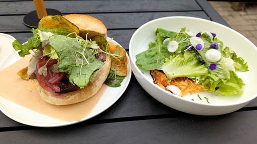 Read moreSmall interior with the baked goods near the entrance and provided small menu selection for lunch, breakfast, and beverage. At the back is an open space where the meal is prepared. Services - I see mixed faces some pleasant and others just having a day. The one taking the order is friendly and kind. I ordered the braised brisket sandwich and rutabaga fritters. Also, a tart and a latte spice something (forgot the name). Made the payment for dine in and was given a flag number. Took a table out on the patio and the tables inside were occupied. The day was overcast with a light wind on occasion. Tried the tart and the meringue was good balance in the sweet flavour. The yellow part seemed more peachy texture and flavour was not sure but nice. It was difficult to cut through the tart and almost had the tart slide off the plate. Overall ok. A gentleman brought the latte spice and was polite. The latte was enjoyable and I have to try it again as I am not a latte person but really like the blend of taste and aroma. The sandwich and fritters took some time and was brought out from their kitchen staff and the person took care of how the plate was placed and presented on the table. The decor on the fritters was lovely and in my mind did question about rutabaga as it is my first time hearing about it and tasting it. The brisket sandwich had the fresh greens colour which caught my eyes. I did see the fresh chips and I wished I had more. Overall presentation does give the vibe that has been harvested from the farm/ garden. The flavour and taste - the fritters is a yes I would order it again. It is not a heavy meal nor an oily meal. The sour cream, fresh crunch leaves, and the light seasoned fritters worked nicely. Maybe wished the fritters flavour can be enhanced a bit more as the sour cream would overtake in the bite. The brisket sandwich - the greens dressed, tender meat and picked onions and the bread really good. There were some bites the pickled onions were a bit salty or over took the surrounding flavour and just tasted solely the pickled onions alone. Overall both plates looks great and tasted good. As I was leaving there seems to be a wait in line to...