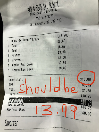 Read moreWaited 25 minutes to get my order at the drive through, but it was at noon so in the peak. Had to wait in the parking lot after paying which is not too bad but with the price of gas and the heat of summer it is a pain. When the guy finally brought our order for 4 people, he just kept stuffing my face with the different bags and boxes (for the kids), without giving me a chance to actually grab the stuff. I thought I was in a comedy show when I turned my head to say "seriously?!" but he was already gone. We had quite the laugh for how ridiculous it was but in terms of service I would have rated 0 stars, since on top of that the cashier was stone cold. The food was tasty as it is always the case at A&W and that's the only reason I...