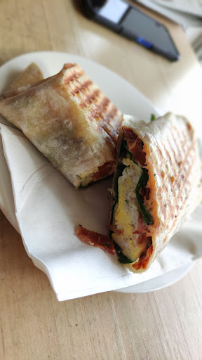 Wonderful customer service. Welcoming and chill atmosphere. Really tasty food with a range of options for a café. We got a chicken wrap and "sushi pizza." Great price for the portions. Parking is paid in front or free but limited time...