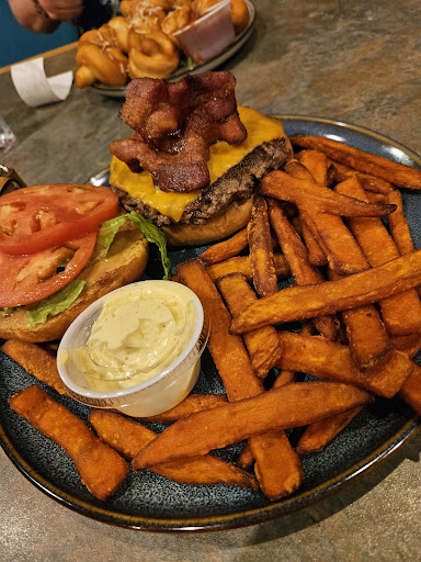 Freemans -Lower Sackville I admit I am not the hugest fan of this place, though I do like the Steak and Pickle Pizza. I decided to give the Peanut butter bacon burger a try. Description- BUTTER BACON BURGER Slathered with chipotle & peanut butter, topped with crispy bacon, cheddar cheese, lettuce, tomato & onion. I asked for no onion and went with sweet potato fries for the side. Was it slathered in Chipotle and peanut butter, I'd say no. I didn't really taste the chipotle sauce but the burger as a whole was not dry, I just expected it to be a lot of sauce from the peanut butter and chipotle. It was pretty decent. I have had others that have been better, but it is still something I would order again. The sweet potato fries were the best part. Good portion and they were good, they came with the curry mayo. As for service, they were definitely busier than usual and only 2 people running. Drinks were slow. I was asked my food order 3 times. We did end up moving tables. So then our bills were also a mess, but we got it...