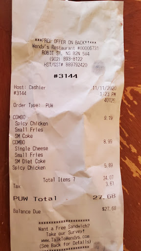 Read moreUsually Wendys is good, and I only eat fast food when we travel to Antigonish ,or Turo,and used to count on Wendys, i didn't expect to throw near half of out, the double buger had one soggy piece of lettice with brown spots on it,a chunk of over ripe tomato both went in garbage, her fries chewy greasy, for sure sat to long, so the whole commitment, of we make fresh, really failed today Wendys, you def have produce issues at that location, and who ever hands out a pre made salads, better inspect, you could make people sick,notiblly out of date, a $34 meal for 2, is not cheap, butit should at least be fresh and prepared to the expected standard. today Aug 18,2021 around 6,we stopped ordered 1 Large Chicken Raspberry salad, a double burger, my wife had a spicy chicken, Combo, her burger was perfect TY , so that and the 2 drinks pass , those were only part of all the food, that was acceptable edible, the salad was Really brown lettuce, all through it, gross and no exaggerating, I share a review for only 2 things, when you do excellent i say so, when you make a small mistake, who cares, I dont go to Google, but you mess up 50 % of a meal, you get the one star you deserve, the location Manager should be watching...