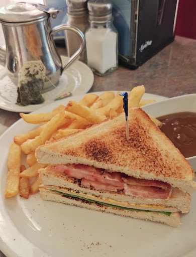 A good restaurant with a moderate size menu, pretty much the standard fare for this type of place, restaurant attached to a motor hotel. My turkey club sandwich was actually very good, albeit a little on the expensive side for the size of sandwich. An ample serving of nicely done French fries set off the maybe slightly small sandwich. For most people this is an adequate meal and the sandwich was actually surprisingly filling. I wasn't able to finish all my fries. The service was good with smiles and friendliness all around. I was originally looking to give a three star review but the sandwich was really much more filling and appealing than it may look in this photo and coupled with the good, friendly service I figure that this place may warrant that fourth star. If I could, I'd probably call this place a 3-1/2⭐...