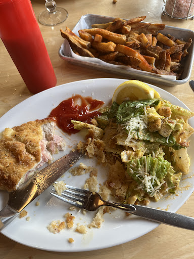 I had the chicken cordon bleu, which wasn’t bad. However, I ordered the side Cesar salad. The salad that I got was almost like a cool ranch bbq dressing. I mentioned to the waitress that I think they swapped my salad on accident, and she said that was the chef's Cesar’s dressing. I asked if they could just make a regular Cesar salad, but they said no, and they brought me fries instead, which I said I was okay with. Now, the fries were inedible as they were just coated in seasoning salt. Way overdressed! My grandma had the fries with her chicken Parmesan (which she said was good), and her fries were properly seasoned.
