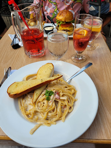 The place was super nice. Beautiful terasse! Our waiter was super friendly and very polite. Its the first place since the pandemic that we have finally got nice polite and good working staff! Food was delicious and prices were awesome. We took the table d'hôte for 34$ you get an entré on your choice, a nice big plate of delicous main course, it also comes with a huge piece of desert of your choice and a coffee! We were more than full! I took the Carbonara pasta that had so much taste and was nice and creamy with cesar salad. And my friend took the burger with goat cheese! Was sooooo delicious. Their potatoes had great seasoning on them to make them even more tasty! I recommend greatly. Perfect for a family outing, looked around other people's plates and their kids menue was very nicely presented and pizzas looked awesome as well! Will return 100%. Too bad we didnt take our waiters name cause he was truely so nice and attentive and gave us a great service. Tall guy in his 20s maybe shaved head! Deserves a tap on the shoulder for great work! Ohh and their...