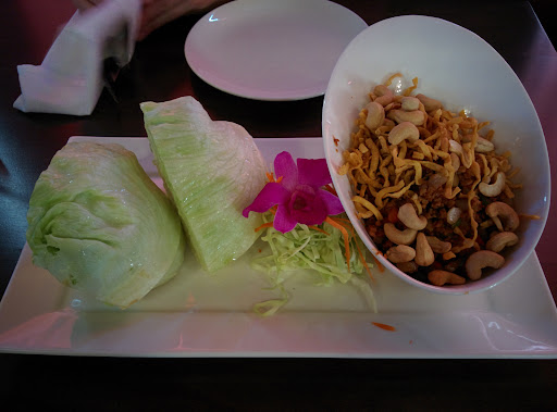 Read more🌟🌟🌟½... Had lettuce wraps with pork, they were excellent a definite must order again item. For our mains we ordered pineapple cashew rice with prawns and sweet and sour stir fry with chicken. The pineapple cashew rice was again excellent just watch out for the tails on the prawns. The sweet and sour stir fry with chicken is nothing special, and the chicken we find has a weird texture which is now the second time we've encountered this. We had to try the mango sticky rice, the presentation was pretty but the green dollop of rice was something different. It was very bitter and even the pink rice tasted different to the white rice, and we wouldn't order that again as you don't even get a full mango for the price you pay.