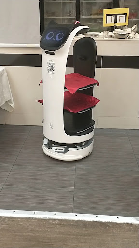 The restaurant is large, with smaller private rooms, a medium sectioned off ish room that is kin of connected to the kitchen, and a large main room. Beside the kitchen, there is a hallway that leads to the washrooms. They also have these robots with cat faces that are animated, that bring you your food. However, you can't take the food off yourself, the waiters have to take it off for you. There are these TV screens/pull down not TV screens thingy with projectors and stuff all around the restaurant as well. The washroom was clean and pretty. Along the way to the washroom, you can see the fish and lobster in the tanks. There are pictures/paintings on the walls. The chandeliers are fancy. There's like this mini stage but with tables on it.