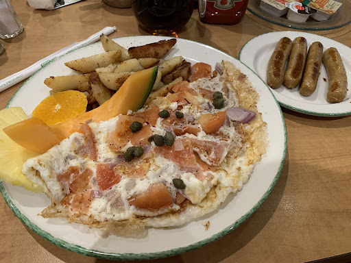 Read moreA Cora special Breakfast priced at $12.15 gets you 1 large egg, frozen pre-blanched and mechanically processed potatoes, 4 pieces of very limp under cooked bacon, 1 sausage link, a piece of ham slightly grilled on the flat top, with a dense not fluffy pancake and some fruit filled with preservatives.