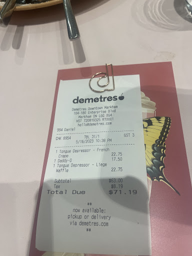 Demetres is a dessert restaurant next to the movie theatre in downtown Markham. Though the space is pretty large, don't let that fool you into thinking grabbing a seat will be simplistic. This place gets pretty popular at night, so get there early. But once you do nab a seat, be prepared to enjoy your booth seating in a whimsically decorated space with pinks, greens, yellows, and a general joyous theme :)