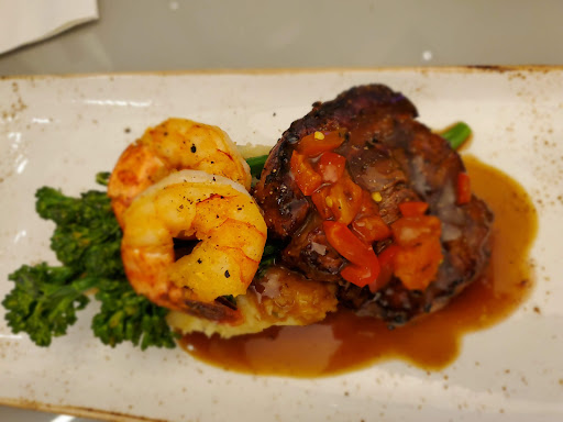 Now for the main course. We both got the grilled beef tenderloin, his medium-rare and mine medium. First off they were a little burnt and super salty. His was more of a medium cook than medium rare while mine was more medium-well. The broccoli had little to no seasoning but was still good. The mash was nothing memorable. It was very generic and bland, no flavoring whatsoever, mine was even lacking salt. The shrimp was alright, again mine was a little salty but nothing compared to the beef.
