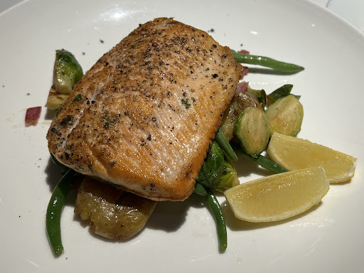 The Arctic Char was awesome. The fish was perfectly seasoned and cooked. It was soft, moist and savoury. The veggies (Brussel sprouts and green beans) were crisp and delicious. The potato was soft and delicious.