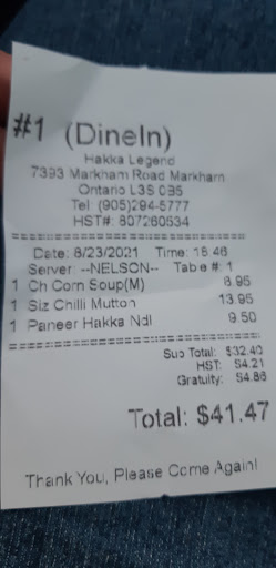 Read moreCUSTOMER WARNING! This restaurant charges gratuity even for 2 people, and this is nowhere mentioned on their website. We were shocked when we saw this at the time of billing, as no other restaurant in Toronto that we've been to in our 15 years here has ever charged gratuity for a party of less than 6. The gratuity amount came out to be higher than the HST and we had only 1 appetizer and 2 mains. Anyhow, if the customer service was excellent, I would've happily agreed to this, but it was far from excellent. Not once did anyone bother to come and ask how the food was or if we needed anything - we had to get up and go to the centre if we needed anything. Their terrible customer service ruined the dine-in experience for me. We started with sweet corn chicken soup, which we order at almost every hakka place. We usually never provide feedback if something is slightly off, but in this soup all the chicken pieces were dry and rubbery, hence I chose to tell them. Leave aside asking us for details or understanding the issue, the guy almost cut me off and in a very defensive tone said "we use white meat" to which I said that "we love white meat but it shouldn't be dry and rubbery of course" and he just looked in dismissal, not a sign of acknowledging what we're saying, leave aside offering to replace the dish. Before he came we had mentioned it to the waitress very politely, whose reply was "it could be because of cornstarch" which made no sense at all. And she just stood there as if that was it! The mutton dish could have been very good but the salt level was almost double of normal standards (and by no means do I eat less salt). Hence I added a lot of vinegar to cut the salt to make it edible, but of course I didn't bother to tell them as they didn't seem to care at all. Not worthy of the compulsory gratuity one bit - you guys should make sure your services do justice to your policies! And you should definitely take a training course on...