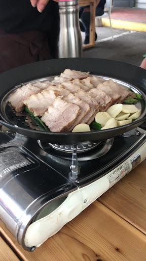 Now to the food!!! This restaurant centres around their signature Kalguksu (칼국수), King-size dumplings, traditional Bulgogi and sliced steamed pork known as Bossom. The Kalgusku or home-style noodles come with 6 different options you can get veggie, spicy veggie, Clam, meat, dumplings or gyoza and spicy pork bone soup. There are three house special Bugogi's such as the Junsik with marinated sirloin, the Pork Bulgogi made from marinated BBQ pork, and the Spicy Pork Jaeyuk Jungsik. Two more of the featured dishes are the house special Gyoza (King-Size Dumpling) Home-made king-size steamed dumplings made with thin dough & filled with meat & vegetable. The other is the Steam Pork dish known as Bossam, served on a table-top hot plate with fresh garlic and green onions. The server will light the gas-fueled hot plate for you when they bring out the Bossam. You can order various combos. set meals and hot pot sets as well. One dish that is very popular is the seafood pancake, which is big enough for two so be careful if you order this dish it's huge!!!