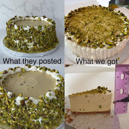 When we opened the box, we were a little confused because it didn’t look like the one they posted in their video. The one we got was much shorter and had way less pistachios on top. The website described the cake to have a double layer of pistachio gelato, but this did not look double layered at all. However, the one in their post seemed double layered as it looked a lot taller (double the height of ours), which confused us even further. Our cake also only had bigger pieces of pistachios around the perimeter of the cake and like a dusting of ground pistachios in the middle. The cake in the post had big pieces of pistachios all around the sides of the cake. Our cake’s gelato also seemed to have less pistachios than what we’ve had in their pints. We double checked that we ordered the right thing, and we did. We even reached out to their instagram page to make sure we got the right cake and expressed our confusion/disappointment.
