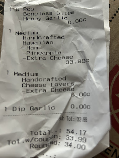 I asked for him to call the owner, which he did and the owner said no. So I paid $31.05 for pizza i did not get. Great job owner. You should be ASHAMED. You could have solved this owner.