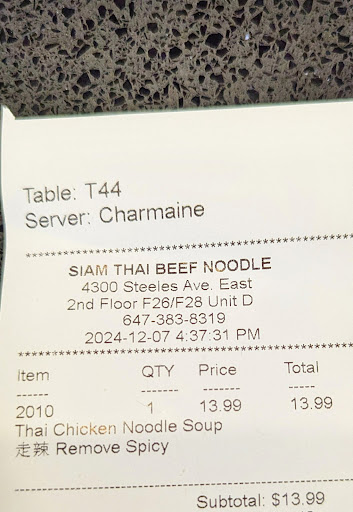 This was my first time eating at SIAM THAI BEEF NOODLE 泰國牛肉粉專門店. I ordered item #2010 ($13.99) - Thai Chicken Noodle Soup (走辣 Remove Spicy). I was pleasantly surprised by how authentic the noodles were and how good they tasted. The service was exceptional. Charmaine and Jessi went above and beyond when I was unsure what to order and asked for their recommendations. I expected them to suggest the most expensive item on the menu, but instead, they recommended the reasonably priced wonton dish. I opted for the Thai Chicken Noodle Soup instead. The ordering process was quick and easy, and the dish was prepared in a reasonable time. I appreciated the friendly shout-out in Thai from the kitchen staff. I will definitely be returning to SIAM THAI BEEF NOODLE the next time I'm at Pacific Mall. I'm also eager to try their delicious mango dessert and Thai tea. Overall, I rate the restaurant at 4.5 ⭐ with both the food and service...