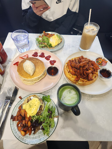 Food/Drink Recommendations: Gochujang Chicken and Waffles. The chicken is well seasoned and marinated. The waffle is crispy on the outside and fluffy on the inside. The dish comes with a side of kimchi and maple syrup. Earl Grey Pancakes. 3 large fluffy pancakes topped with an Earl Grey creme, served with maple syrup, sliced strawberries, and a berry sauce on the side. Mushroom Truffle Eggs Benedict. Two perfectly poached eggs on top of a bed of sautéed mushrooms and a warm English muffin, dressed with a smooth hollandaise sauce. The side salad is a mix of greens, carrots, cucumber, and red onion paired with a Japanese style dressing. The homestyle potatoes are seasoned and spiced. Some may find them spicy. Matcha Latte. Can be ordered sweet/unsweetened, and a variety of milk alternatives are offered. The matcha is well distributed throughout the drink.