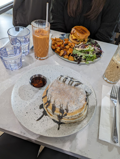 Food/Drink Recommendations: Gochujang Chicken and Waffles. The chicken is well seasoned and marinated. The waffle is crispy on the outside and fluffy on the inside. The dish comes with a side of kimchi and maple syrup. Earl Grey Pancakes. 3 large fluffy pancakes topped with an Earl Grey creme, served with maple syrup, sliced strawberries, and a berry sauce on the side. Mushroom Truffle Eggs Benedict. Two perfectly poached eggs on top of a bed of sautéed mushrooms and a warm English muffin, dressed with a smooth hollandaise sauce. The side salad is a mix of greens, carrots, cucumber, and red onion paired with a Japanese style dressing. The homestyle potatoes are seasoned and spiced. Some may find them spicy. Matcha Latte. Can be ordered sweet/unsweetened, and a variety of milk alternatives are offered. The matcha is well distributed throughout the drink.