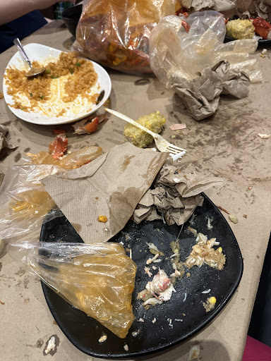 Food presentation was horrible. We ate on top of a table that wobbled enough to stick out into the aisle, covered by a sheet of paper, using paper cups, Styrofoam takeout containers, and a diner style napkin dispenser. We were given paper bibs and plastic gloves, and our food came in bags that we had to reach into or dump onto the table. The bibs were made of stiff paper, so not only were they uncomfortable, they wouldn't stop falling off and they kept lifting up away from our shirts. I do understand that this restaurant serves a style of cuisine that is a bit more hands on, but for a place that dares to charge $100+ for two pounds of seafood, I found the dining experience to be unforgivably disappointing.