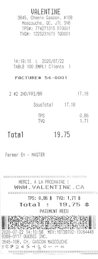 Mon fils et moi y avons mangé vitement le 22 juillet 2020 au milieu de l’après-midi. Nous avons commandé deux # 2 soit des trios hot-dogs à $8.59 chacun pour un total de $19.75 avec taxes. Les employés avaient une attitude distante. Le port du masque était obligatoire comme partout ailleurs dû à cette supposée pandémie. Nous avons pu nous asseoir à l’intérieur sur une banquette. Nous pouvions remplir nos verres à volonté à la machine pour les breuvages. C’était de la restauration rapide donc rien d’extraordinaire comme dans la majorité des restaurants Valentine. Je n’ai seulement que le reçu de caisse à vous proposer comme photo.
