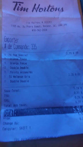 Read moreSuccursale Tim Hortons propre et visiblement rĂ©novĂ©e rĂ©cemment. Par contre, le service Ă la clientĂšle est tout simplement horrible. On a dĂ» rĂ©pĂ©ter notre commande plusieurs fois et personne sâen occupait. Les employĂ©s couraient partout comme des poules pas de tĂȘte (mais le gĂ©rant, yâĂ©tait oĂč??) et faisaient nâimporte quoi sauf servir les clients. Le service devrait toujours ĂȘtre la prioritĂ©, mais ici, câĂ©tait ben loin dâĂȘtre le cas. Deux employĂ©s sâacharnaient Ă nettoyer des machines pendant que plusieurs clients attendaient leur commande en sâimpatientant. Il a fallu interpeller un employĂ© qui passait et insister fortement pour finalement recevoir ce quâon avait commandĂ©. Sinon, on serait jamais servis. Bref, une expĂ©rience dĂ©cevante qui donne pas le goĂ»t...