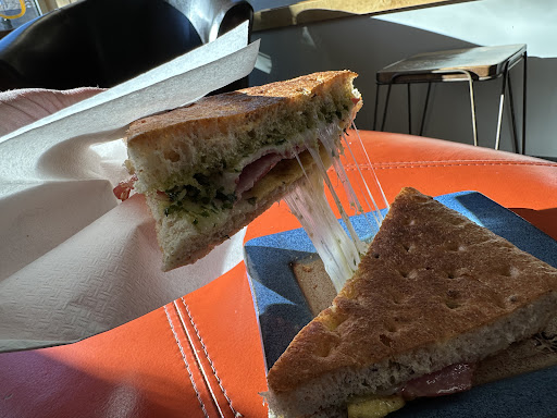 We ordered coffee and the breakfast panini. The coffee was brewed perfectly — rich and aromatic. The panini with pesto, ham, and cheese was simply fantastic! The cheese was creamy, melty, and wonderfully stretchy, while the bread was crispy, fresh, and full of flavor. Inside there was also a soft omelet — such a light yet satisfying breakfast.