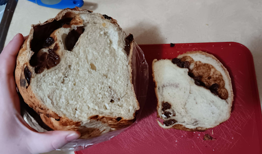 Raisin bread: there was a pocket of raisins on the top of the loaf, which all fell out when it was cut. Very few raisins were mixed into the loaf, I basically just picked them up and put them on top of the slice to have white bread with raisins on it. The bread itself had a nice texture to it, but it was by no means raisin bread.
