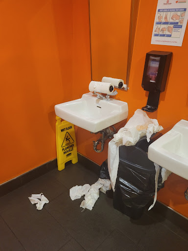 There is a fountain drink/ketchup station.......but the garbage is somewhat hidden around the corner....so many patrons were just leaving their empty ketchup/straw packaging on the counter or floor.......I wouldn't want to be the person looking after THAT area 😮💨🤮😡