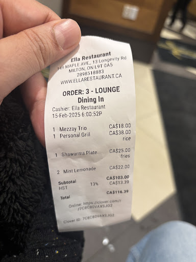 Read moreParamount used to be one of our favs for tasty immaculately cooked shish tawouk in Milton. Sadly with this new approach that the newly renovated Ella restaurant has taken their priority seems to have shifted from amazing food to jazzy ambience. The whole place looks way less welcoming now for families with kids or of certain look, ethnicity perhaps, I am not sure what is going on. We visited this place last week and were seated to the side of the restaurant on the covered patio end, not in the main restaurant. They have made minor changes to their menu and removed some of the kids favorites like the garlic cheese bread, cookies etc. We ordered our usual shish tawouk wrap and meal and requested the waitress to make them spicy. When the order came neither the meal not the wrap shish tawouk were made spicy they were the regular ones. Second and most disappointingly the wrap was stuffed with soggy fries (60-70% of it) with very little chicken and some pickles. Overall it tasted really bad!! If I wanted to eat fries I would go to Mc Donald's, where atleast they are crispy and not hidden inside a shish tawouk wrap as cheap fillers. When we asked the waitress who was serving us, she reacted equally surprised like us and said yes that has never happened before blah blah and that it was a mistake. We returned the wrap which she took back to the kitchen but never came back with an explanation or apology to us. After waiting to be attended to for almost 10-15 mins we waved at her and requested for some boxes. She never came back with it, instead we saw her leave guess it was end of her shift. And we continued to wait for another 10ish mins before we could wave at another waiter, asked him to bring us some boxes and the bill and explained the issue with the food. He got us the boxes and then sent another waitress for the bill to whom we had to again explain the issue with the wrap. This one completely changed the tone and said that they have now moved to the more "traditional" way of making shawarma and wraps with fries! In the end she removed it from the bill as the menu did not indicate that the wraps are now mostly filled with fries instead of chicken. Overally really bad experience, food and service and ambience all need a lot of improvement if they want to see any returning customers. I for one will not be...