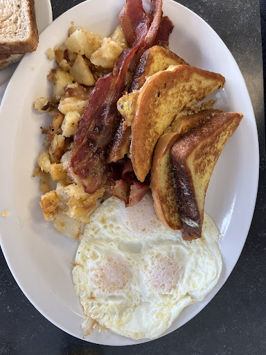 The rest of the staff is great too. Louie's partner in the kitchen appears to crack six eggs with one hand simultaneously while buttering perfect toast, crispy on the outside, while light and airy on the inside. The eggs are perfectly cooked over easy with the perfect consistency of the golden yolk running out in slow motion when priced by a fork. And the French toast has a perfect texture that has just the right chewiness to leave you satisfied. And what could be more satisfying than the bottomless cup of coffee? Well, the smile of the enchanting blonde waitress who made our day.