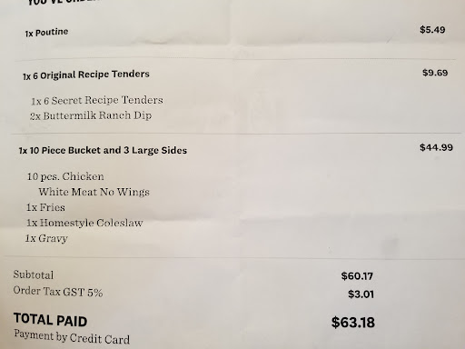 I know I am writing this about 2 months after our last experience with this KFC. I am not sure if it is this location as well as others but the chicken has gotten worst over the years. At this location it has gotten more and more bland like. I barely taste the colonels 11 herbs and spices if I taste them at all. When I ask for spicy (cause usually it was more flavourful than regular) they always gave me regular even after double checking and things were always missing from my order. This last December we order the gravy lovers family pack and it was the worst by far. 1) they actually forgot the gravy and I only noticed this when I got home. I probably should have doubled checked before leaving but it seemed obvious that wouldn’t be missed considering it was the gravy lovers 2) the chicken was over cooked - the coating was burnt so it was kind of “dusty” texture to the outside. Yeah I probably could have taken it back but it was later in the evening and this was dinner for the family so having to go back and wait - it just wasn’t worth it. I guess we were that hungry. After multiple times trying this location and hoping that it would improve- this is the last time we will go there and probably any KFC if they don’t improve quality control with their franchises. Given all the other fried chicken choices we have in Mission now, this location needs to do better cause at this point they can’t compete. It’s too bad - had fond memories of KFC as a kid many moons ago. Having said all this about the food - I do want to say that the staff were courteous so that...