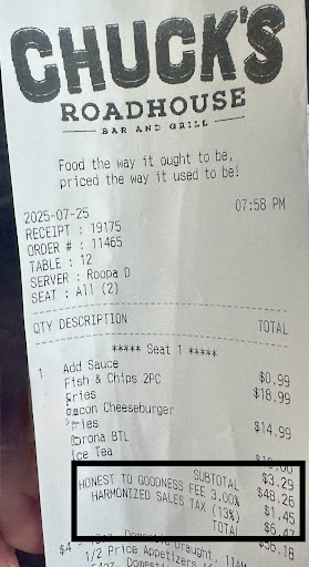 I noticed on the bottom of my bill an Honest (lol) to Goodness charge. I asked the server what it was. She said, “I don’t know they charge this to everyone”. Then she walked away and brought the female bouncer – server who deals with people that don’t like this charge. She said, “it’s a charge we have that allows us to buy food in bulk”. I said OK but that is not legal, it is not posted anywhere, I was not made aware of the charge, and I want it removed from my bill. This woman stated, “its posted on our website”, I informed her I did not pull up their website and read all the text, which is not legal anyway. She went on to state “It’s not a tax!”. I said I didn’t say it was a tax. I want the illegal charge removed.