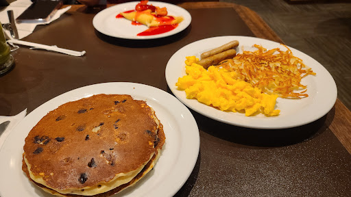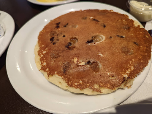 After being seated and placing our order we waited about 35 to 40 minutes, which seemed abit long for a simple breakfast when they weren't overly busy at that time. I ordered the cookie dough pancake breakfast and I'm not really sure that's what I got, they tasted more like regular chocolate chip pancakes and there was no cream cheese spread drizzled on it like the pictures showed. Upon mentioning this the server said she would bring me the included blueberry syrup and I had to correct her that it was cream cheese. It came to our table in a small plastic sauce container enough for a thin spread on each pancake.
