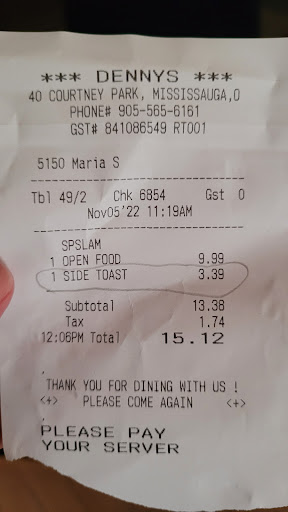 ย ย ย Read moreI arrived at this Dennys before 2PM and was told to wait for 5 minutes. Around 10 minutes later we are seated, we order drinks and two orders of pancakes to start around 2:20PM. Around 2:40 we finished our drink and asked for a refill, and still no food. At 2:50 we ordered more food because we thought there was a delay so we would order food now to get it after we get our pancakes. At 3PM my girlfriend ends up going to the washroom to throw up, due to starving and also having the lemonade might have upset her empty stomach. At this time now there were tables that sat after us and were already eating their food. Even the table behind us had laughed that we never got our food yet. While sheโs in the washroom our entree was brought BEFORE OUR PANCAKES? I go speak to the manager and he says he's coming. He never shows up and the waitress brings us 1 of the 2 orders of pancakes almost 15 minutes later. It is now 3:20PM and The pancakes tasted horrible, the hash brown was cold and our toast was served without any jam or anything. The next order of pancakes comes and they are DELICIOUS, look entirely different than the first order they brought which doesnโt make any sense. By this time now, Iโve lost my appetite and im annoyed. Me and my girlfriend were sour, and didnโt want to eat anymore. I ate a bit of the pancakes and left it there. In the picture if you can tell the pancakes look like two different pancakes, made from different restaurants. The manager tried to make an excuse about our waitress being off of her shift, even though she was there until 3pm. He made us pay for the drink which I felt was a slap in the face, and on the receipt it stated we were seated at 2:41. I asked about this and he said that was the time we were switched to another waitress, which doesnโt make any sense because if that was true our food was still put through, so where was our food then? I usually donโt write reviews but this is a horrible experience, left us angry and still hungry and a waste of 2...