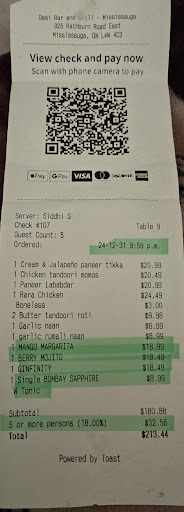Then we ordered our mains 2 methi malai kofta, 2 kadhai paneer, and naans to go along with them and one person wanted Mojito. We got the order, we had food. Our mains were average to taste. My friend that asked for Mojito never got his drink so we asked the server again and also asked for some more naans and then we waited waited n waited for 15-20 minutes and no one was coming to our table. That day the restaurant was super busy and what I was noticing was they were understaffed for all the customers they kept accommodating. They were not really paying attention to the customers who were already inside but just kept seating others.